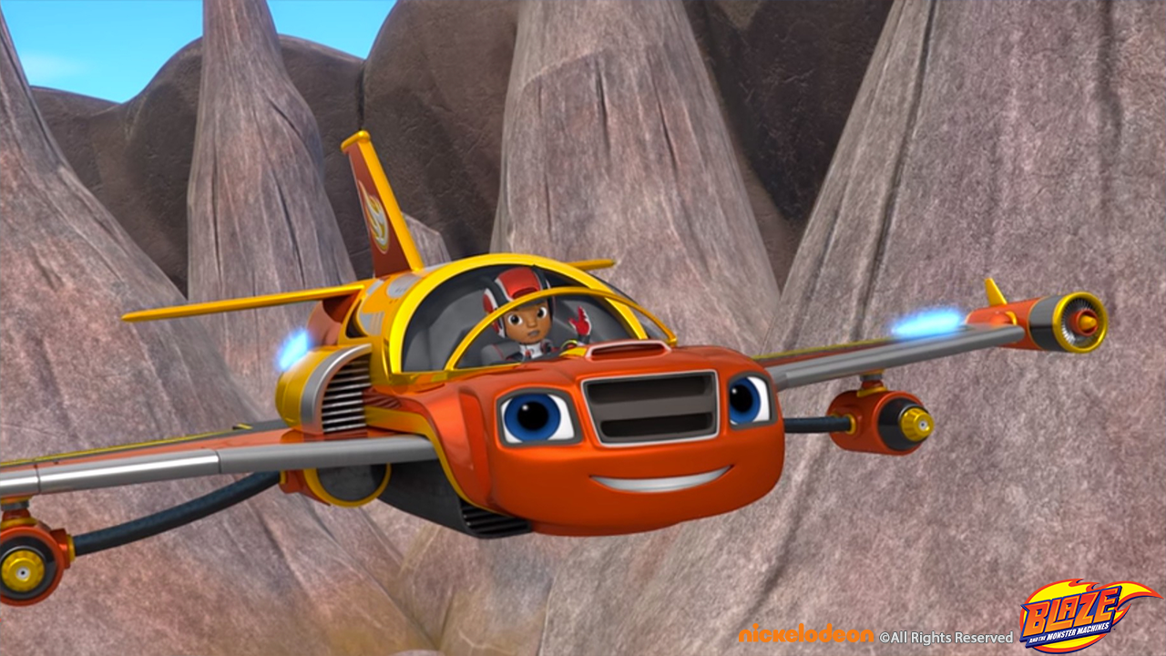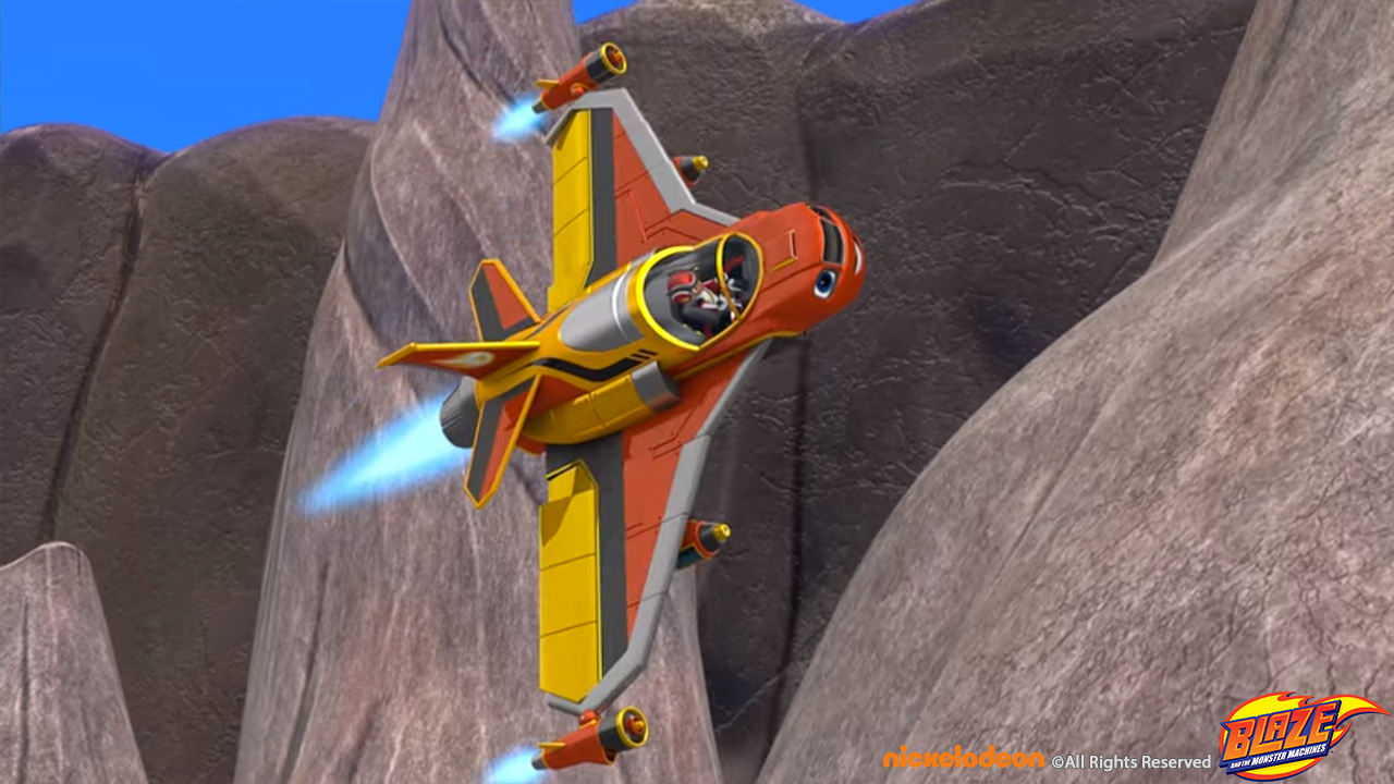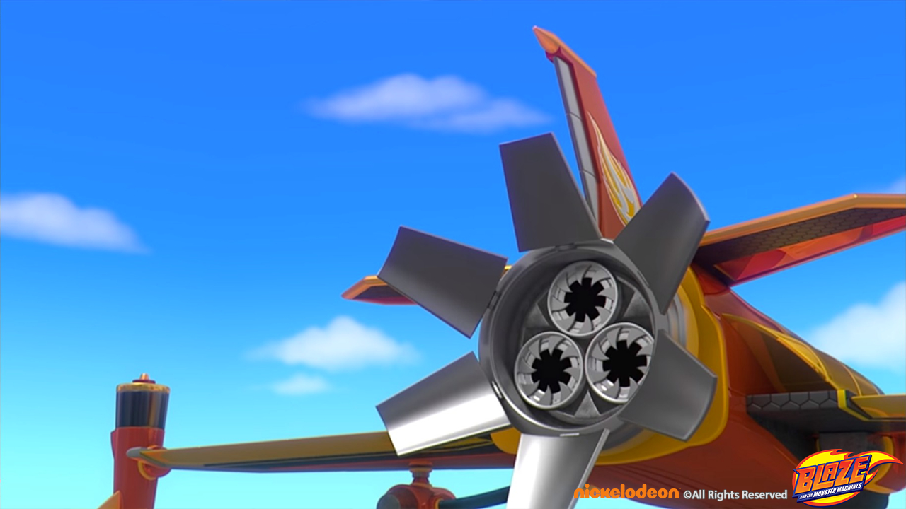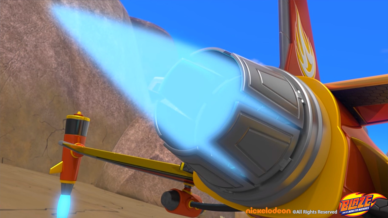 Blaze transformed to a water blaster jet to pass a volcano set and winning the race around the world sequence.